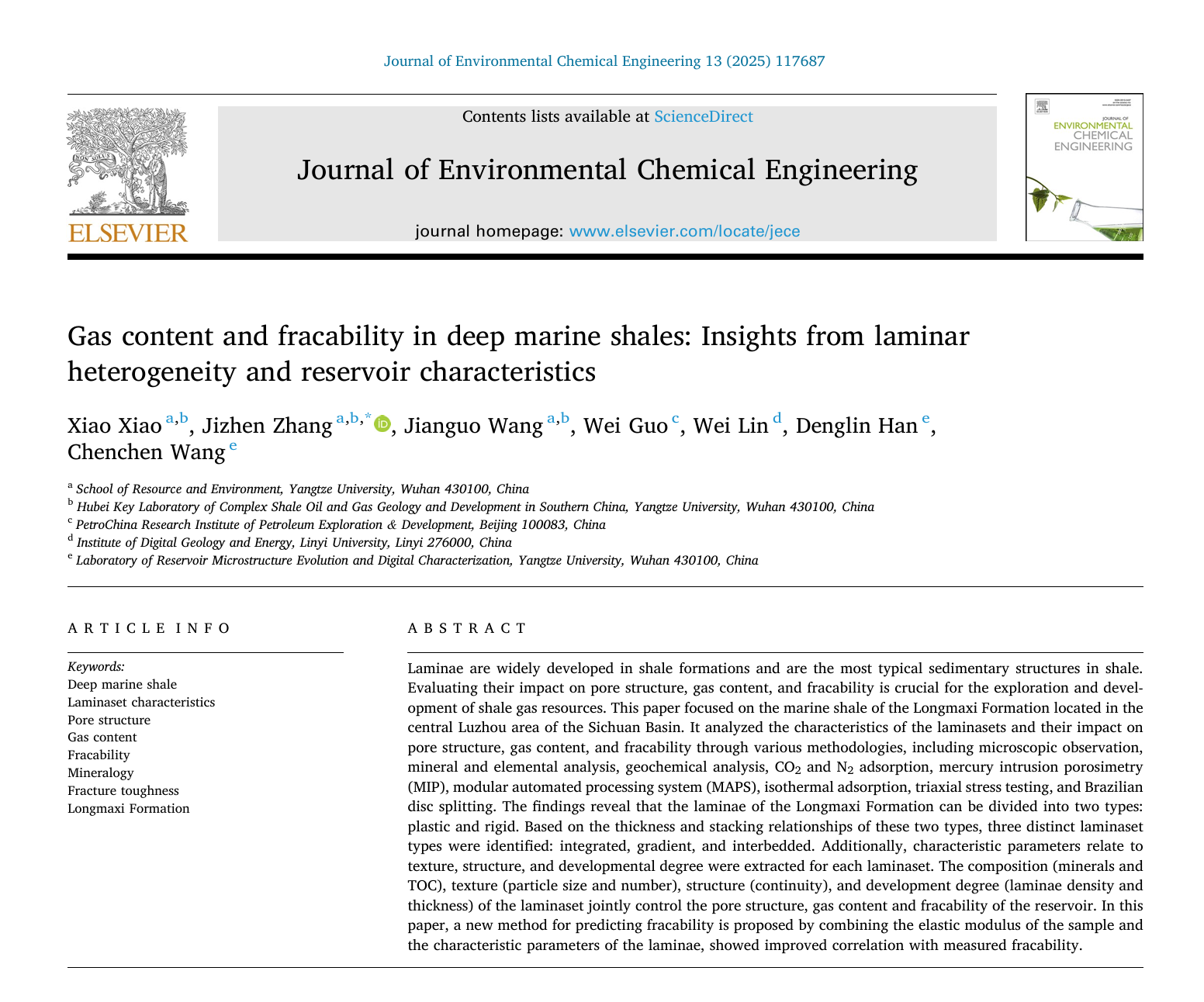 (通讯员 张吉振)在全球能源转型背景下,页岩气作为清洁能源的重要补充,其高效开发成为国际能源领域的核心议题。然而,深海页岩的复杂储层特征(如差异纹层层理异质性)对含气性和可压裂性的影响机制尚未完全明晰。针对这一科学难题,tyc122ccVIP在读硕士研究生肖肖在导师张吉振副教授指导下,在国际权威期刊《Journal of Environmental Chemical Engineering》(JCR 1区,IF=7.2)发表题为"Gas content and fracability in deep marine shales: Insights from laminar heterogeneity and reservoir characteristics"的研究论文,首次系统揭示了多类型复杂纹层层理结构对页岩储层性能的差异性控制规律,为深层页岩气勘探开发提供了科学理论支撑。tyc122ccVIP为第一完成单位。