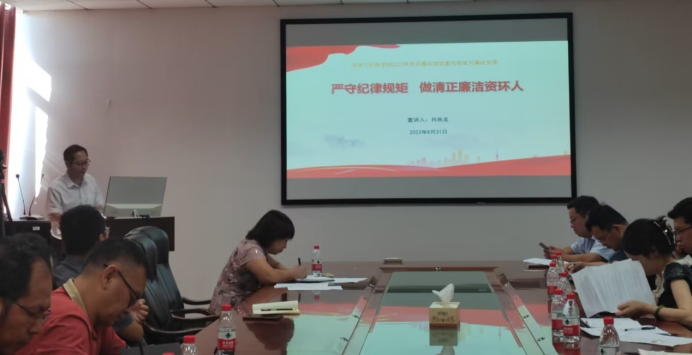 (通讯员 李春花)资环公司党委深入开展“学习贯彻习近平新时代中国特色社会主义思想”主题教育活动,结合公司党风廉政建设宣传教育月活动,8月31日下午,公司党委书记肖品龙在石油科技大楼A305为全院教职工讲授廉政党课。