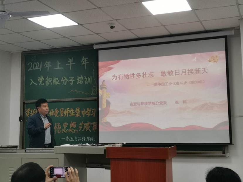 张科书记以“为有牺牲多壮志,敢教日月换新天”主题,展开讲解新中国工业化前30年的奋斗史。伊始张书记用“学党史,敬英雄,立宏志,振中华,”四个词语简明有力的阐述了学习党史的重要性。接着张书记简单讲述了新中国成立前的重大历史事件,用生动的例子向我们展示了党一路走来的艰苦历程。