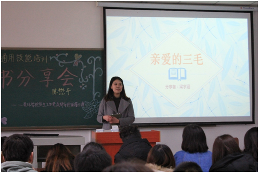 (通讯员 梁赟/文 秦煜萱/摄)众所周知,书是人类进步的阶梯,2017年3月25日下午四点,刘娥老师带领资环公司员工工作党支部在武培B209举行了主题为读书分享会的导师组学习第三讲讲座。为了让大家更贴近书籍,领略文字的美丽,由党支部成员芦鹏飞担任主持人,在导师组成员吴文峰,郝鸿博以及梁宇涵分别精心准备下,给大家带来了震撼的听觉享受。