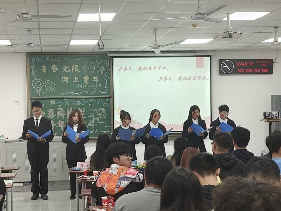 环科22105班以“改革再出发,青年需奋斗”为主题向我们展示了磅礴的红色精神以及活泼积极的青年力量。环科22105班以六人诗朗诵向我们展现了长大学子对长大的依恋之情,中间王泽瑞同学惊艳的一曲古筝让老师和同学都赞叹不已。接着便是游戏环节,同学们踊跃参与猜歌名游戏,让场上的气氛变得更加活跃,结尾时同学们的大合唱《五四青年版错位时空》更是对主题的升华,最终环科22105班获取了二等奖的优异成绩。