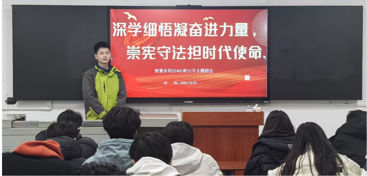 (通讯员 周欣怡 图/文)为深入学习贯彻习近平新时代中国特色社会主义思想,推动党的二十届四中全会精神落地生根,引导青年学子强化法治意识、勇担时代使命,公司各团支部于12月集中开展“深学细悟凝奋进力量,崇宪守法担时代使命”主题教育实践活动。其中,智慧水利22401支部作为本月示范团支部,精心策划组织主题团会,由团支书主持,支部全体同学全程参与互动。