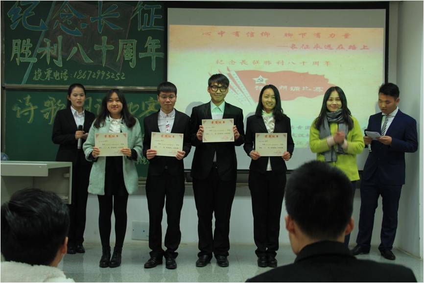 (通讯员 张润佶/文 王雷 吕楠楠/摄)11月27日,由共青团tyc122ccVIP委员会、武汉校区团工委主办,艺术与传媒公司团委员工会承办的纪念长征胜利80周年朗诵比赛总决赛于B104擂响战鼓,来自五个公司的选手在此一争高低,经过一番激烈的角逐,公司选手以以其铿锵有力的气势,充沛饱满的感情摘得比赛桂冠。