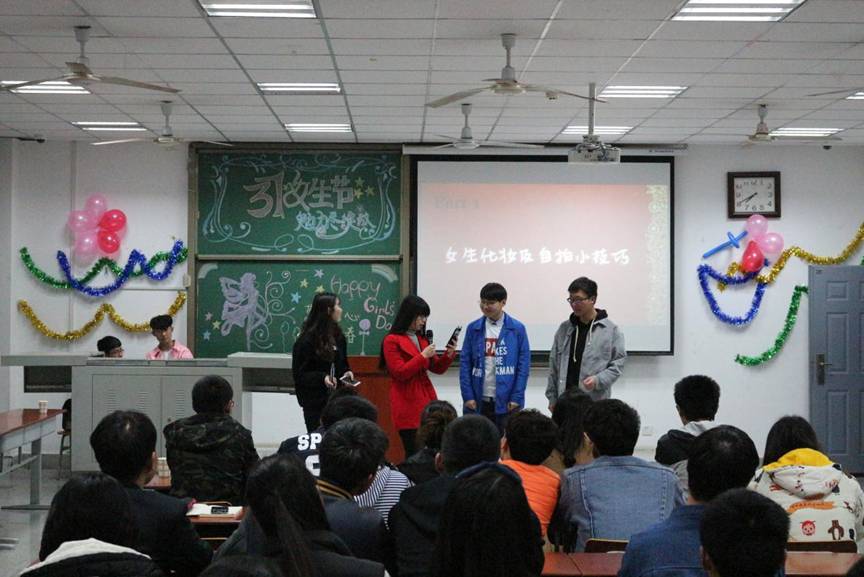 当晚的活动共有四个环节:女生化妆及自拍小技巧、男生女生大盘点、趣味游戏和“非诚勿扰”。在第一环节中,主持人邀请16级的4位同学代表上台为大家表演女生化妆窍门,观众们看着两位男模特由“粗大汉”一步步转变为“小鲜肉”,都毫不吝啬地献上掌声与喝彩声。地化石油之光21601班彭雨晴同学说道:“原来化妆自拍也还有这么多讲究,作为女汉子的我,今天的这些技巧讲解对我有很大的帮助。”