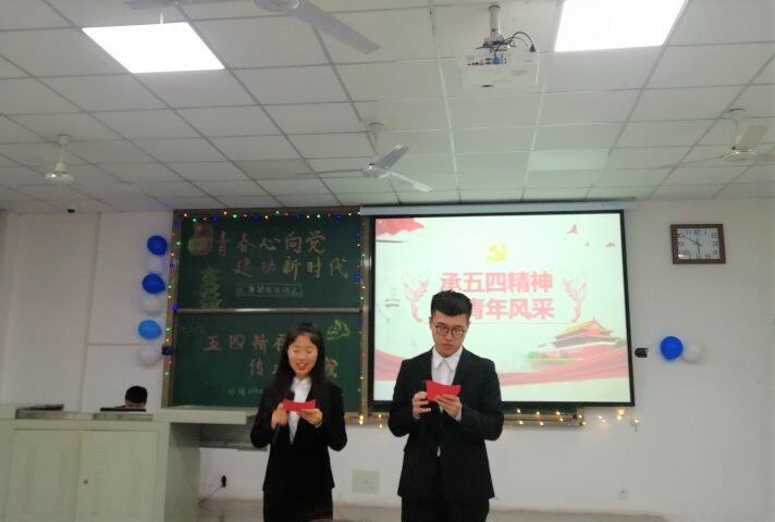 再者,朱吉华、陈倩倩、李广鑫、贺武明四位同学带来了诗朗诵《青春万岁》并带领全体人员共唱团歌《光荣啊!中国共青团》,本次活动在振奋人心的音乐声中接近尾声。最后,刘娥老师对本次活动进行点评,对于传承并发扬五四精神的正能量给予了肯定。