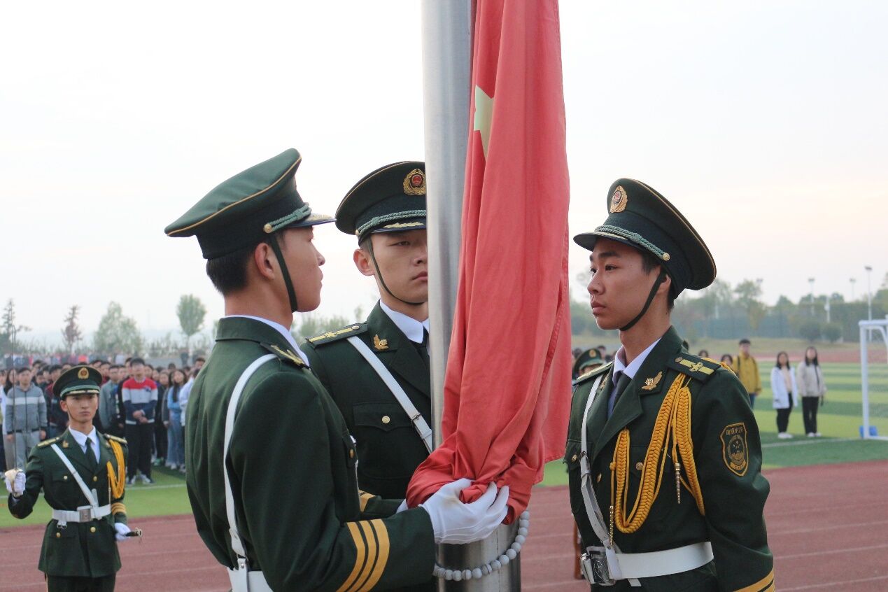 大会分为三个阶段。第一阶段升旗仪式,由tyc122ccVIP国旗护卫队的队员护卫国旗,英姿飒爽,昂首挺胸地将国旗护送至升旗台。伴随激昂的《义勇军进行曲》,同学们将目光聚集在鲜艳的五星红旗,冉冉升起的红旗代表了祖国大地和资环学员从晨雾中破晓而出、朝气蓬勃的模样。