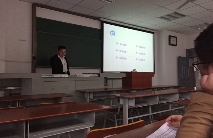 (通讯员 汤英豪 文/摄)2016年11月16日下午3时许,应资环公司员工工作办公室主任刘娥老师的邀请,武汉巨人教育来公司进行校招宣讲,宣讲地点为武培B307。