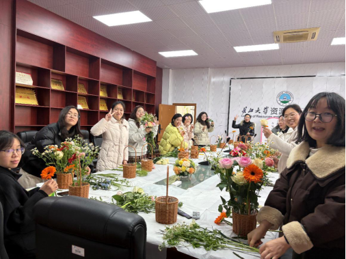 下午2时,插花活动正式拉开帷幕。花艺师现场演绎东方插花技艺,从"上散下聚"的结构美学到"疏影横斜"的空间营造,将中国传统插花六大器型与现代美学理念娓娓道来。"插花如同环境规划,既要考虑个体特征,更要注重整体协调。"水文系陈彦美老师边修剪花枝边向新入职教师传授心得,现场俨然成为跨学科交流的实践课堂。