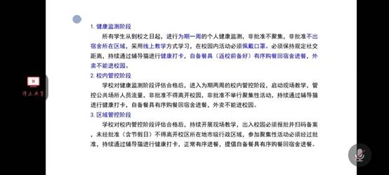 会议过程中向同学们明确了开学时间、开学准备等事项。关于报道,希望同学们可以根据自己的情况在对应的时间返校报道,不要提早到达公司或者无故晚到公司。同时到校后,配合工作人员的工作,进行相应的体温检测、行李消毒等工作。争取做到井然有序,忙而不乱。