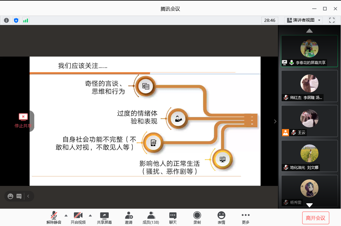 (通讯员 王云 图/文)2020年上半年,突如其来的新冠肺炎疫情打乱了我们的生活,疫情期间隔离在家,尤其是武汉人民、武汉老员工,随之而来的就是老员工疫情期间产生的严重的心理问题,随之产生了“高关怀员工”群体。针对公司员工可能出现的各类心理问题,2020年9月26日下午18:00,资环公司心理专干李春花老师对公司心理骨干130余人进行了线上培训。
