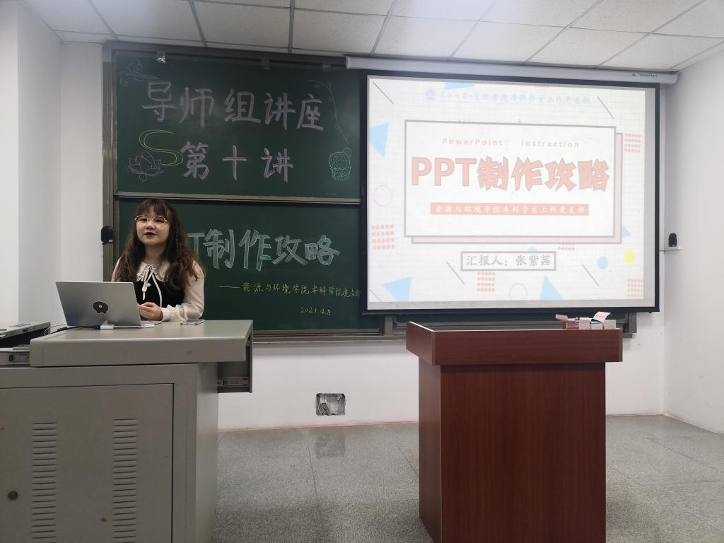(通讯员 李如意)为了让刚开始接触PPT制作的大一员工能更加的得心应手,少走弯路。2021年4月8日晚7时整,资环公司本科员工工作党支部开展了导师组讲座第十讲。讲座由导师张紫茜同学为大家宣讲。资环公司全体大一员工参加。