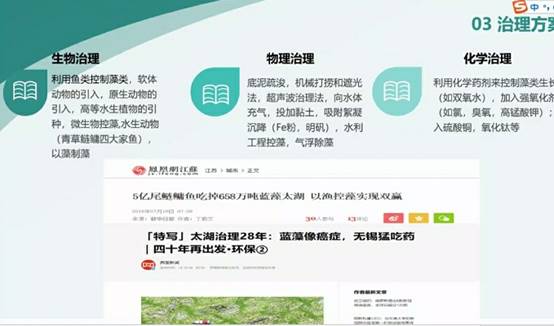 (图为第一组选手对水体富营养化藻类处理提出的三种处理方式)