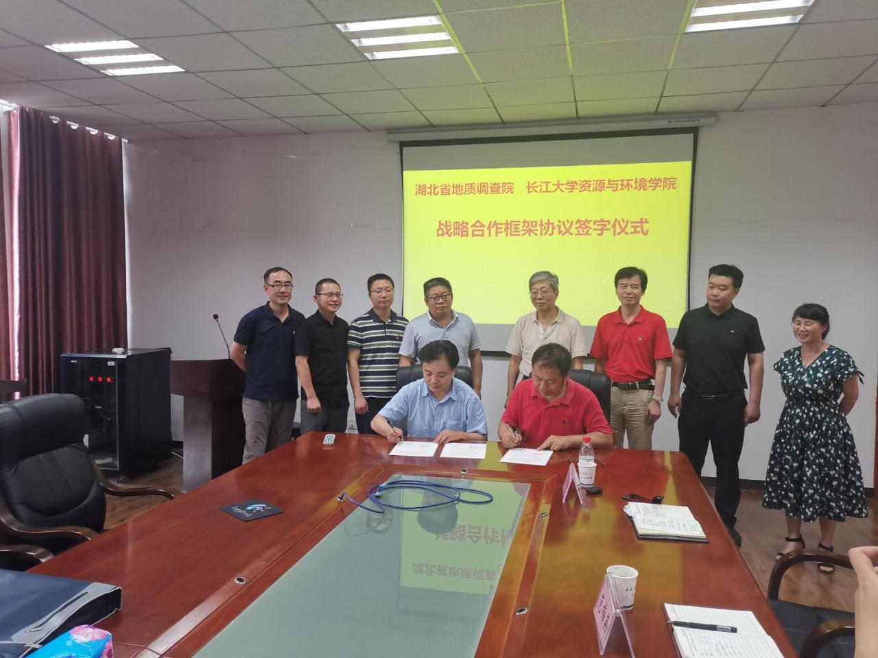 2020年7月1日下午在武汉校区,公司与湖北省地质调查院签订战略合作框架协议。湖北省地质调查院经理戴光忠、副经理孙四权和李一鸣、技术部主任胡飞,tyc122ccVIP副董事长张玉清、科技处处长何文祥、资环公司领导及部分教师代表出席签约仪式。