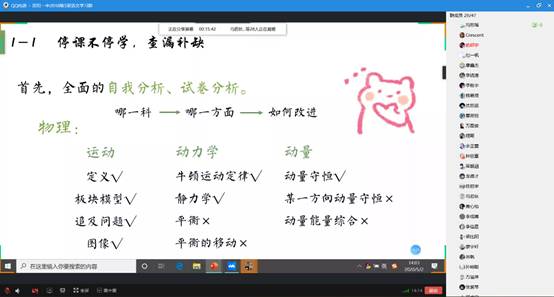 讲座伊始,冯思瑶首先进行了简单的自我介绍,随后引出讲座的第一个部分,“关于延期开学,应该如何学习”,她认为在家里学习很容易荒废时间,家里不像在公司那么紧张,这对同学们的自控能力提出了要求。她表示同学们应该停课不停学,抓住机会,查漏补缺。拒绝“填鸭”式教育,摆脱老师讲什么就听什么、老师布置什么就做什么的思想,而是应该以老师的安排为主,自己的薄弱环节自主加强,随后她着重介绍了自我分析、查缺补漏的具体方法,并举例对其进行说明。