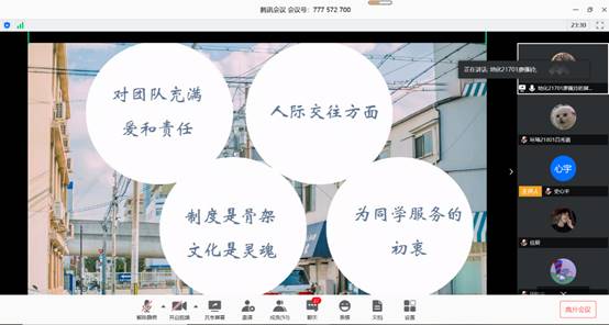 地化21701班廖佩铃同学向大家分享作为员工干部的成长经历。她向大家展示了自己的日常工作,强调作为员工干部要清楚自己的职责所在,踏踏实实地为员工服务。就如何开展班级活动、解决班级日常管理事务等问题提出了独到的见解和方法。同时,她向大家介绍了自己的学习方法和学习空间,教大家如何在保证学业的基础上真正成为员工的管理者、服务者和引领者。最后,通过分享自己疫情期间的生活,提醒各位员工干部要注重劳逸结合,不断提高综合素质。