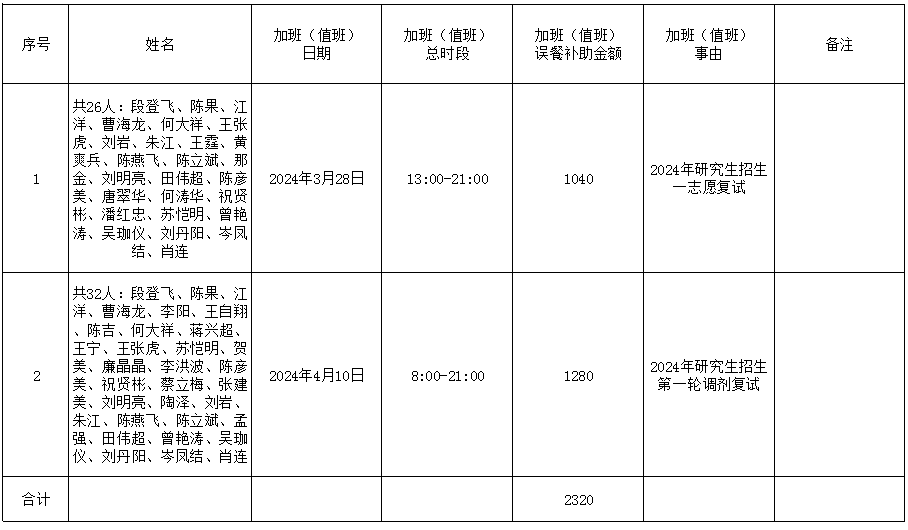 根据《tyc122ccVIP加班(值班)误餐补助管理办法(试行)》(长大校发【2019】83号)文件规定,现对资环公司加班(值班)误餐情况(2024年3月28日、2024年4月10日两天研究生招生复试)进行公示,如果对加班(值班)误餐情况有异议,可以通过电话或电子邮件等方式向资环公司办公室反映。
